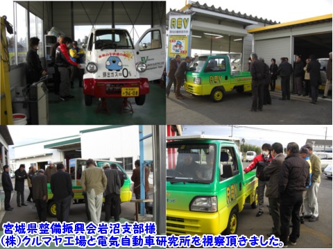 2012年11月18日あいにくの強風の中、マイクロバスで宮城県整備振興会岩沼支部みなさん元気にお越しくださいました。 弊社の改 造電気自動車 軽トラックに試乗したり、EVアドバイザー五十嵐に改造電気自動車の件を色々ご質問もいただきました。会場を変えての研修では、弊社の立ち上げから現在の コンバートEVに対する取り組みや今後の整備事業の展望を弊社代表が熱 弁(汗だくで)させて頂きました。