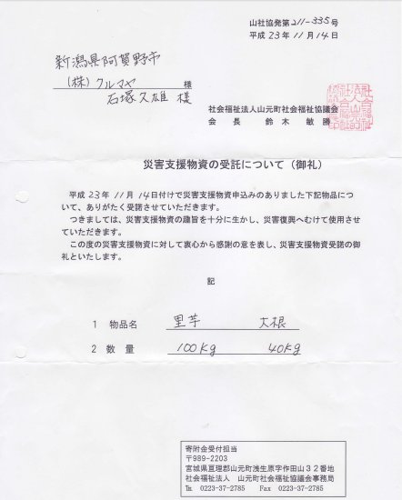 ![]() 社会福祉法人山元町社会福祉協議会 会 長 鈴木様よりお礼状が届きました。 |
